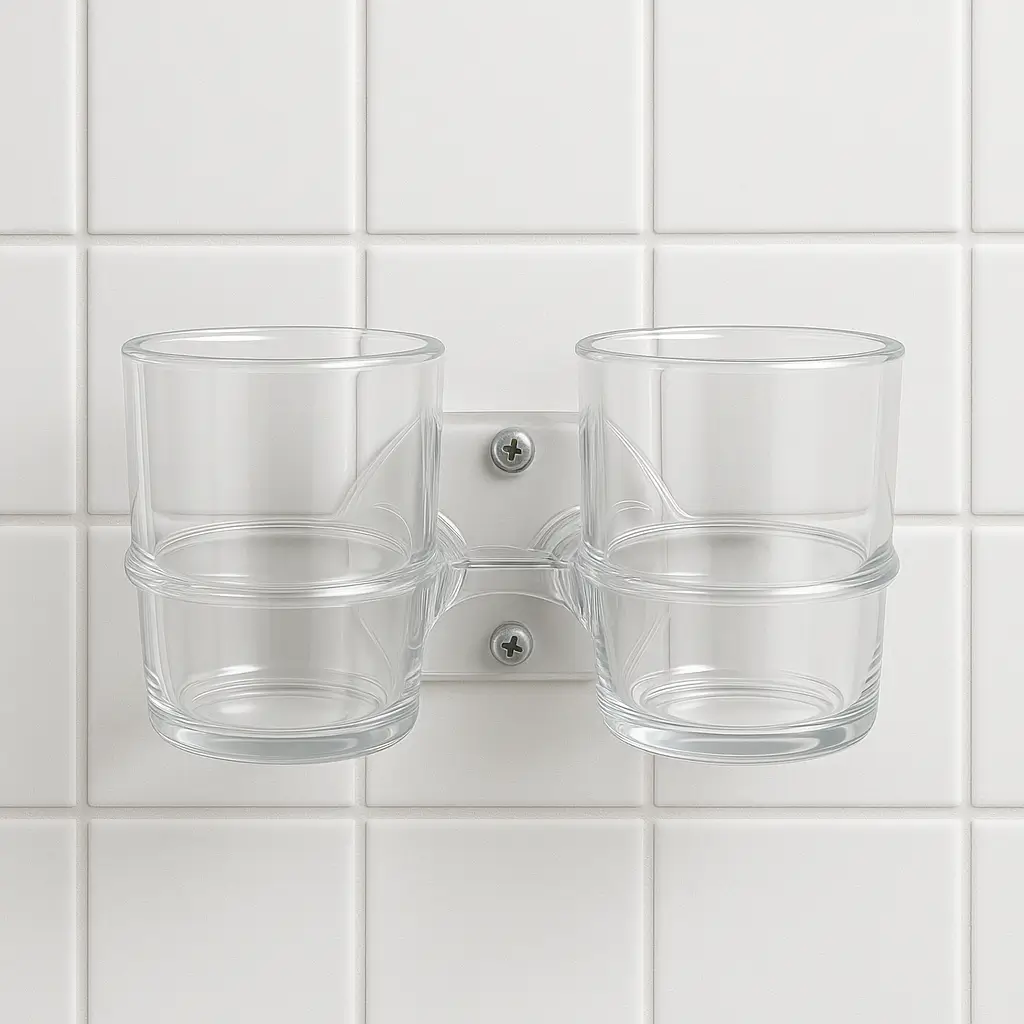 Twee stevige glazen bekers in een stijlvolle chroomhouder, met een solide wandmontage.